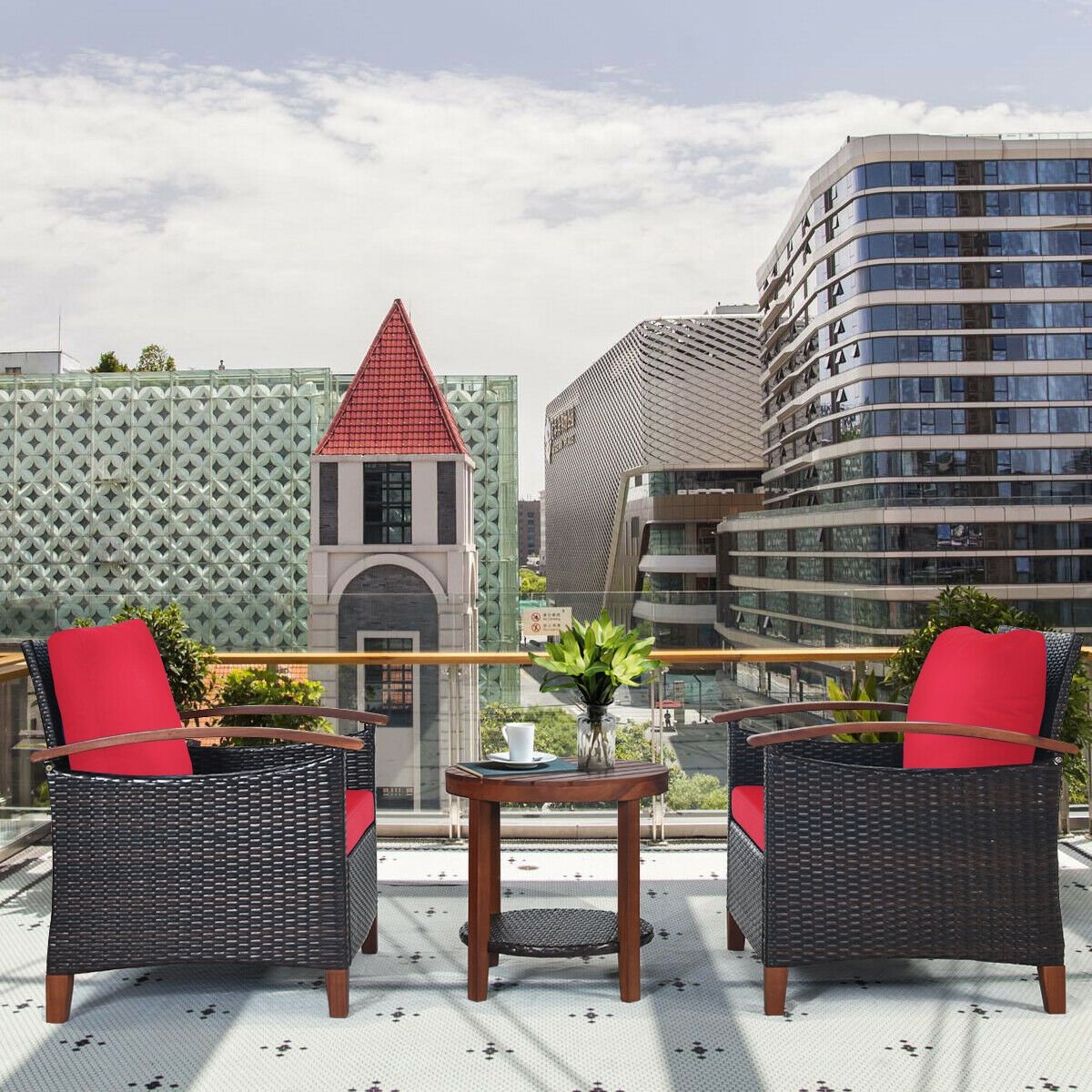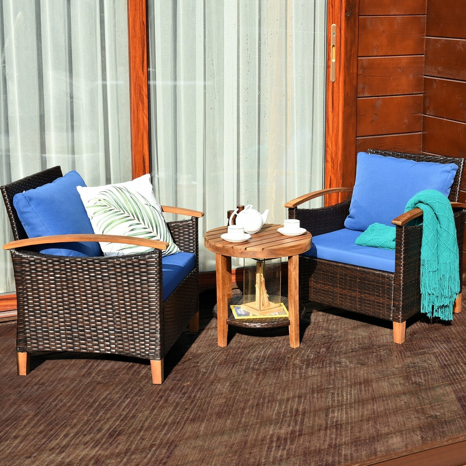 3 Pieces Patio Wicker Furniture Set with Washable Cushion and Acacia Wood Tabletop-Beige