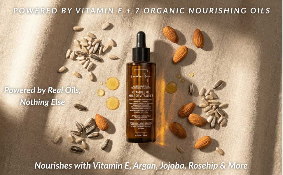 Discover the luxury of Canadian Grace Organic Vitamin E Face Oil.Our organic blend is infused with 70,000 IU of natural d-alpha Vitamin E, the purest, most bioavailable form. Enriched with seven cold-pressed organic oils, this luxurious formula is more than skincare. It is a botanical elixir that transforms your daily ritual into a moment of radiance and care.