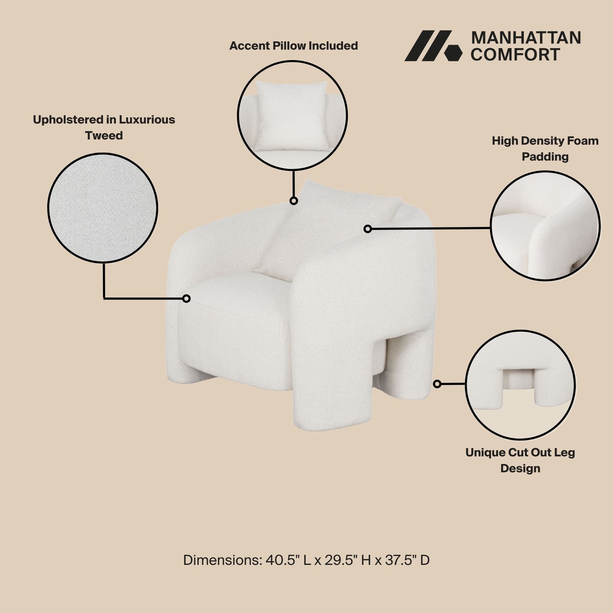 • Upholstered in Luxurious Tweed with High Density Foam Padding. Tight Seat and Back Feature Polyfiber Wrapped Around a High-Density Polyurethane Foam Core