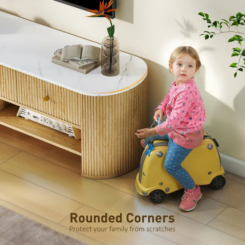 Transform your living room with the Colby TV stand, blending a white marble-effect top, fluted drawer panels and elegant gold knobs for a cozy ambiance. Tame clutter with three drawers and two shelves, creating a serene, organized space. Designed with cable holes, this TV unit keeps wires hidden, ensuring safety. Elevate your home's aesthetic while enjoying a practical, family-friendly solution.
