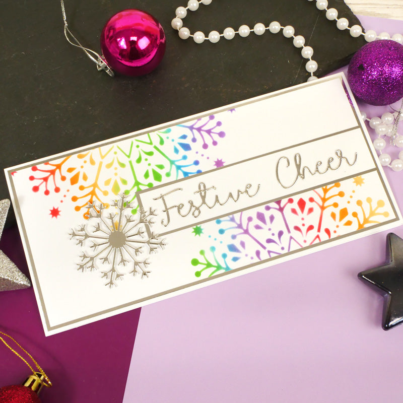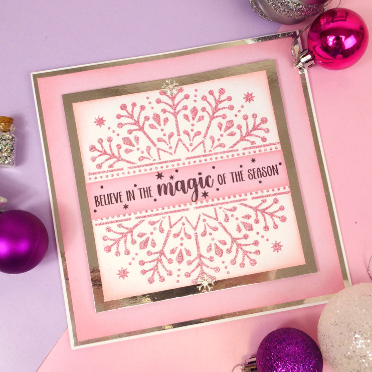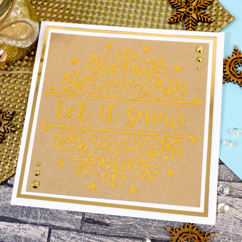 Create fabulous snowflake-themed centrepieces with the For the Love of Masks - Let It Snow Centrepiece 6” x 6” mask. The mask features a stunningly detailed snowflake centrepiece with a dotted border band reading ‘Let it snow’. The centrepiece beautifully sits on a 6” x 6” card or larger. Simply ink through the mask using Hunkydory's range of Prism Ink Pads for a quick, but stunning, centrepiece or alternatively, mask off sections using Low-Tack Tape to ink corners or borders or adorn cards with a sentiment.