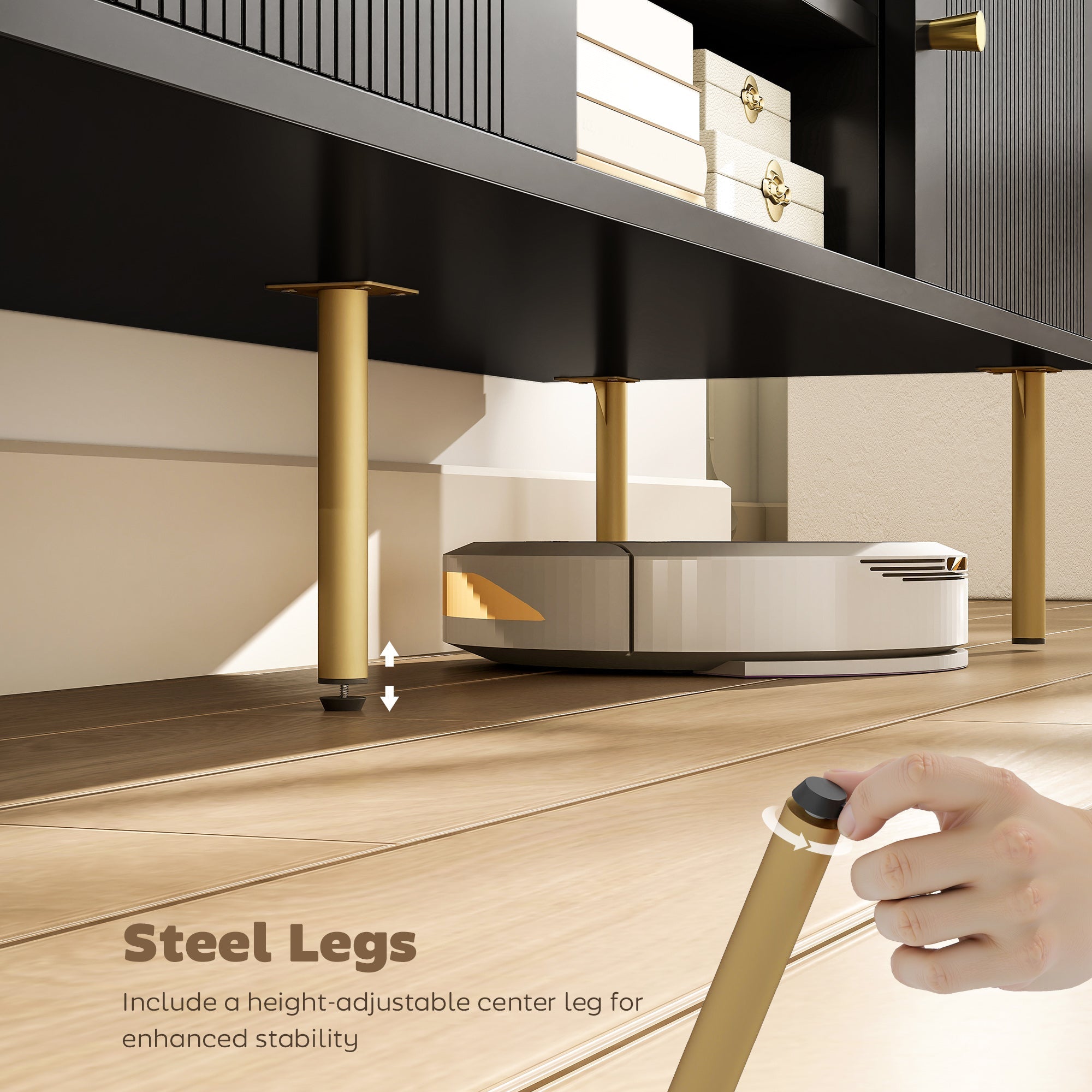 • Black fluted doors with gold legs elevates your decor, fits TVs up to 65"