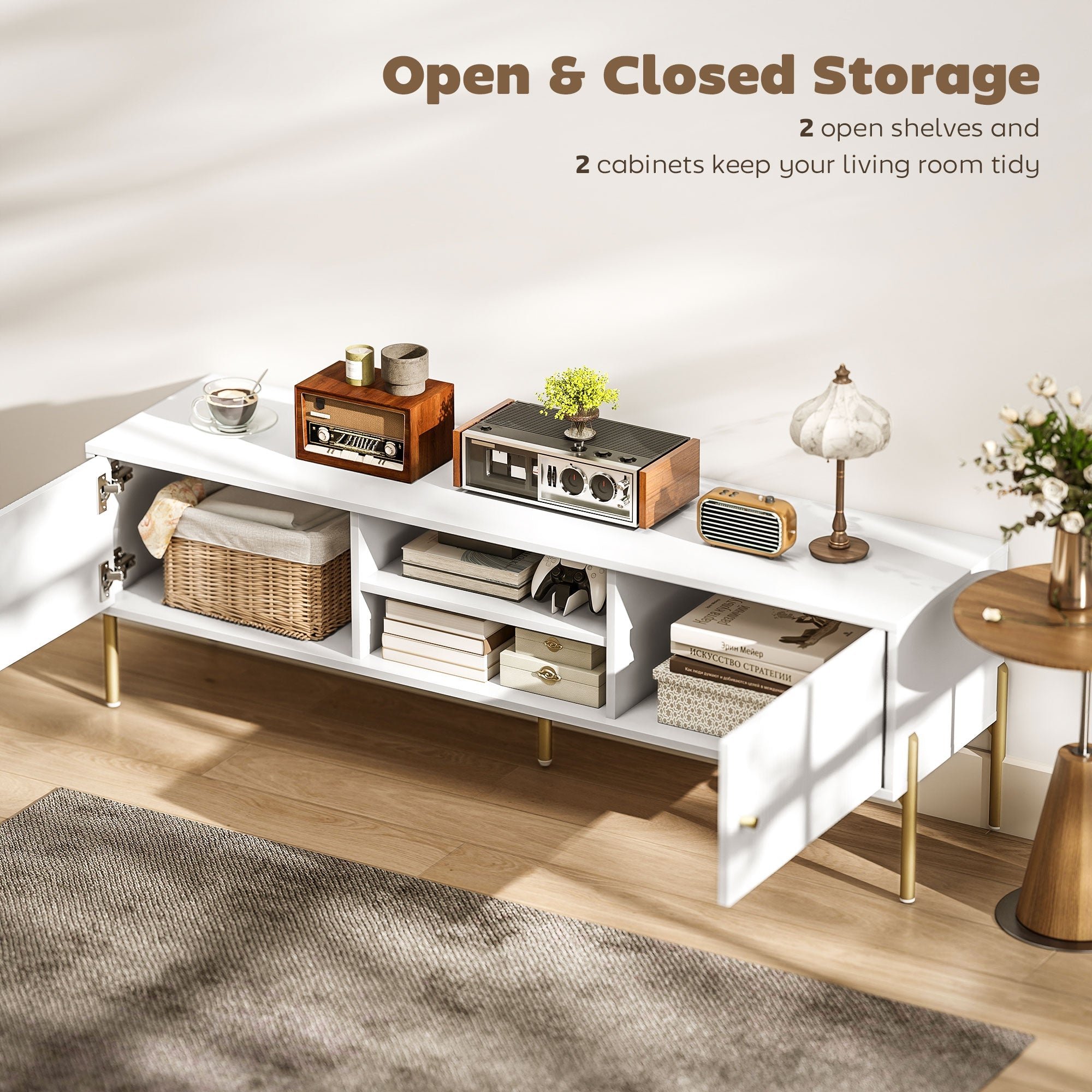 • Black fluted doors with gold legs elevates your decor, fits TVs up to 65"