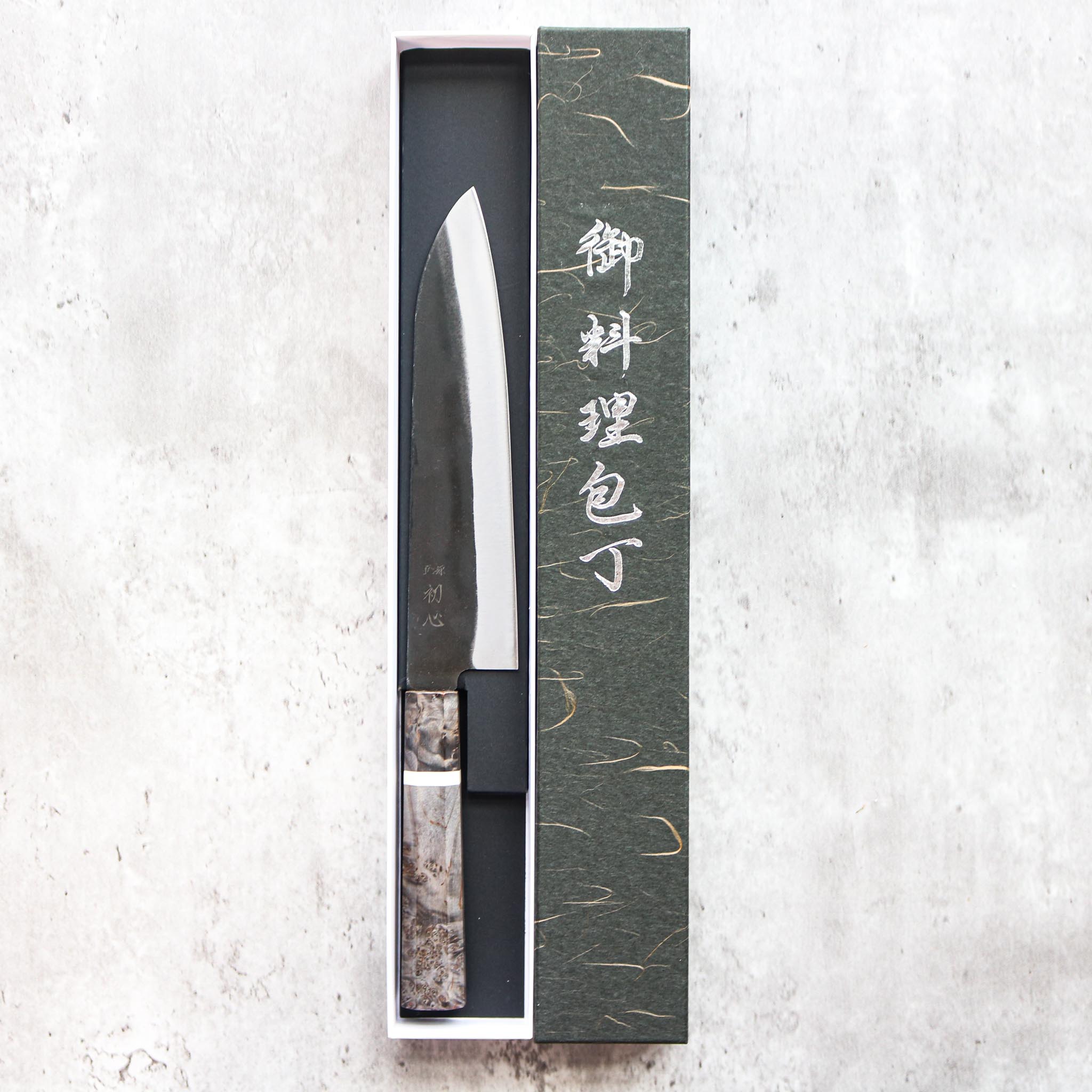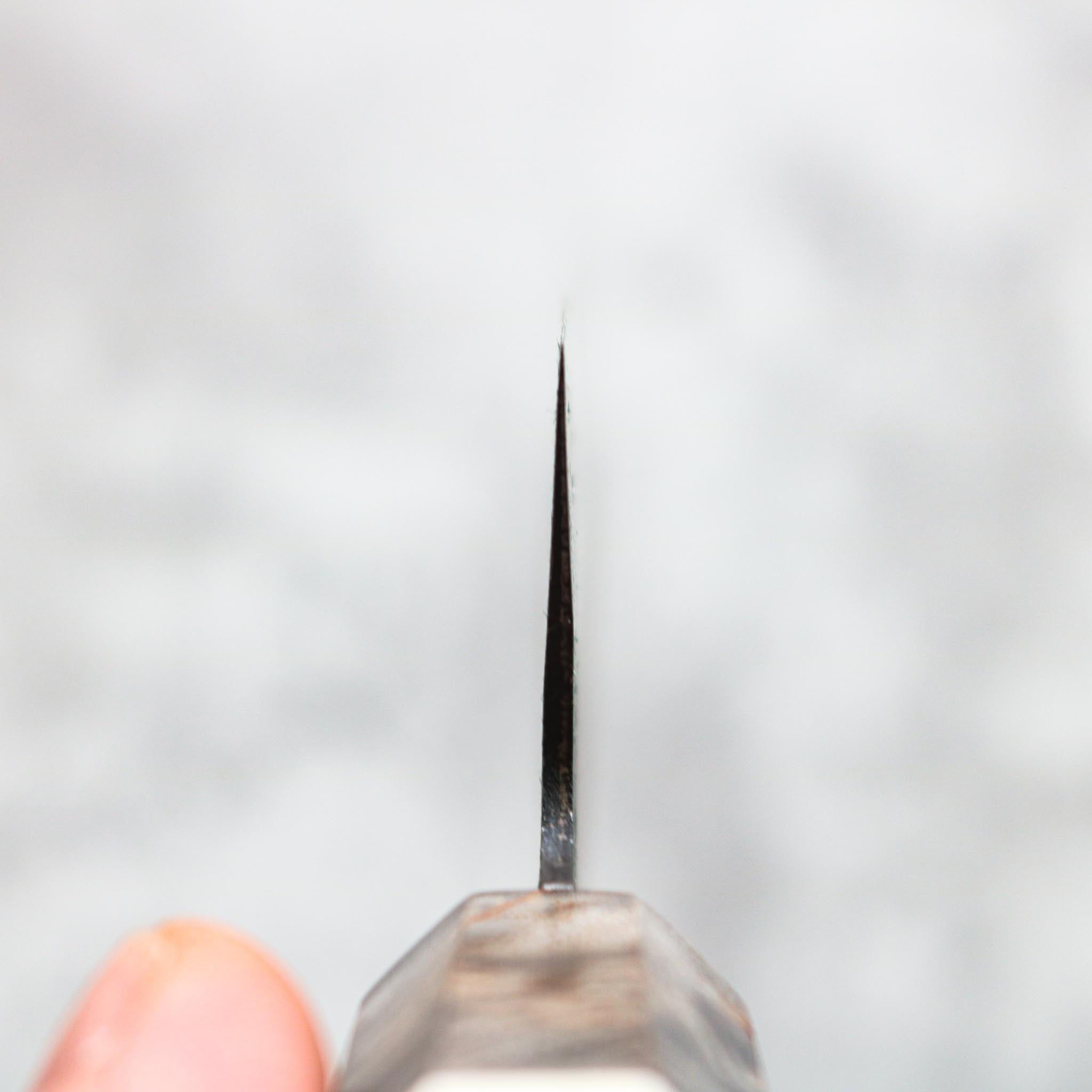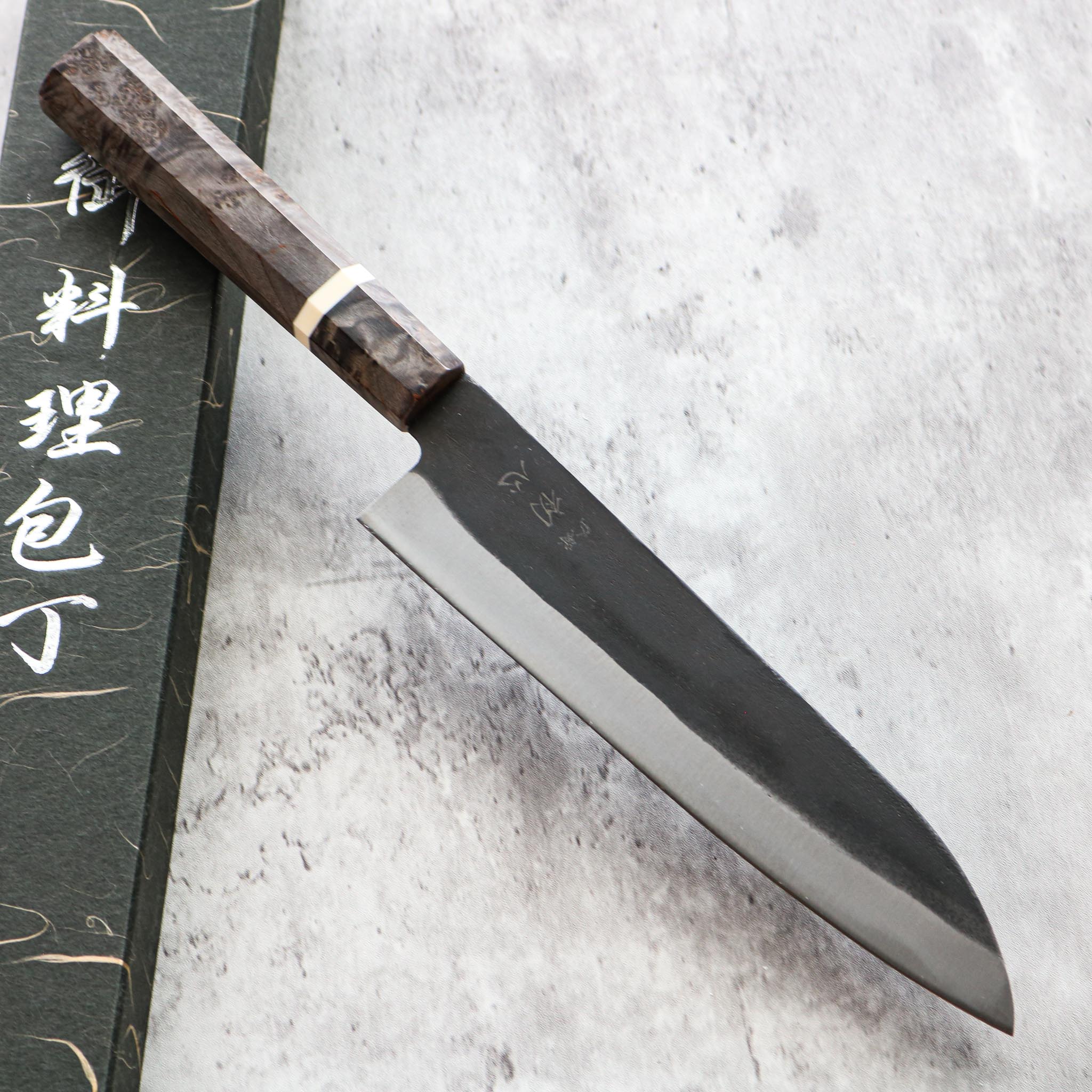 Hatsukokoro brings in masters of smithing, sharpening, and handle making to ensure quality, and a high attention to detail on their knives, so you know that you will be getting an amazing work knife. At the price these Kurouchi finish knives are a must have workhorse for any kit, the blue #2 steel will take an amazing edge, while being slightly more durable and rust resistant than a White steel (but we still wouldn’t push our luck). The dark octagonal wood handle looks great with the rustic style of the blade, making it as much a show piece as a work knife.