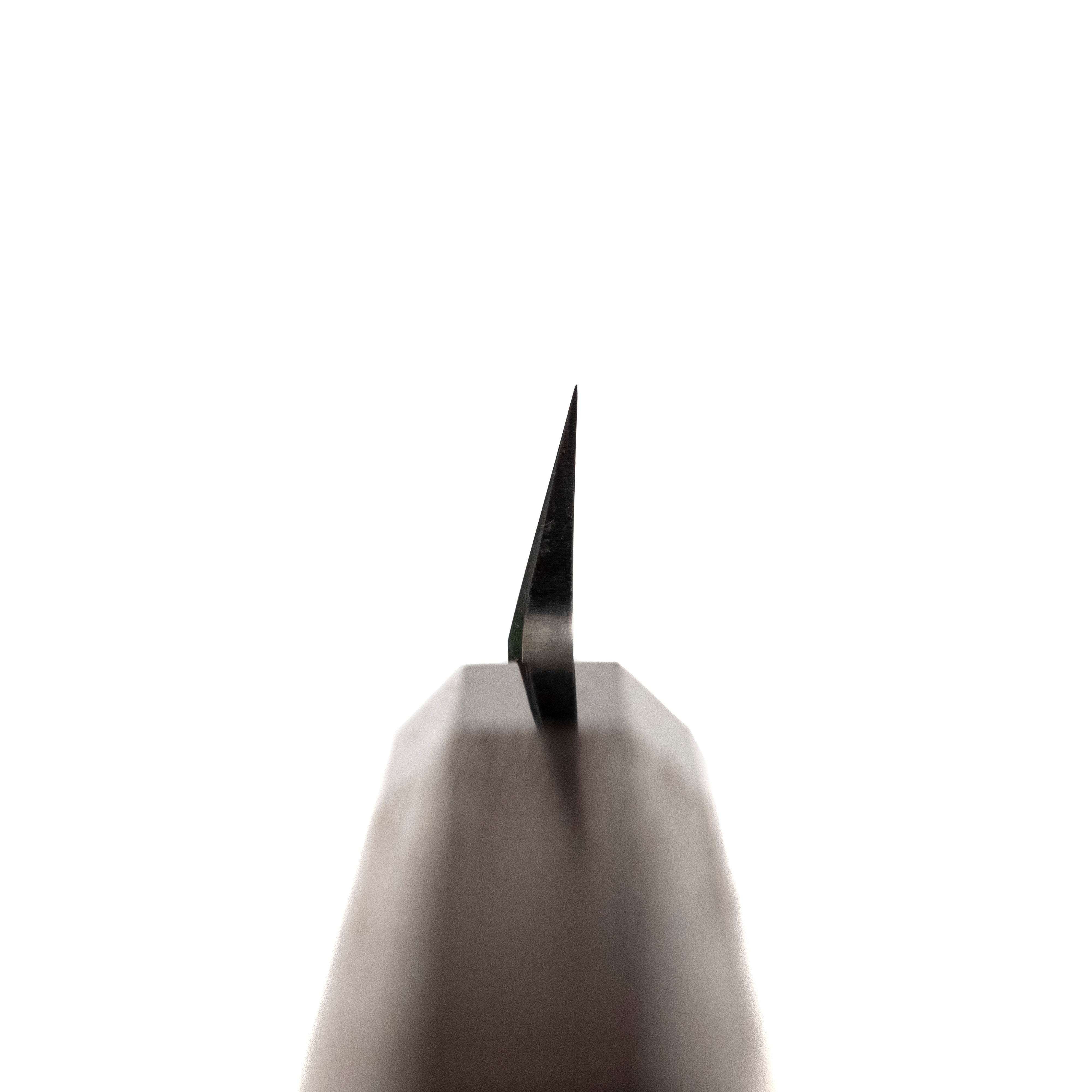 The Shirasagi line comes to us from Tosa city, Kochi Prefecture, Japan – made by a group of undisclosed craftsmen, and sharpened by Myojin-san, who trained at Konosuke (based in Sakai city, Osaka Prefecture, Japan). At the price these Migaki finish knives are a must have workhorse for any kit, the white #2 steel will take an amazing edge and is incredibly easy to sharpen and polish to your liking. The dark octagonal wood handle looks great with the rustic style of the blade, making it as much a show piece as a work knife.