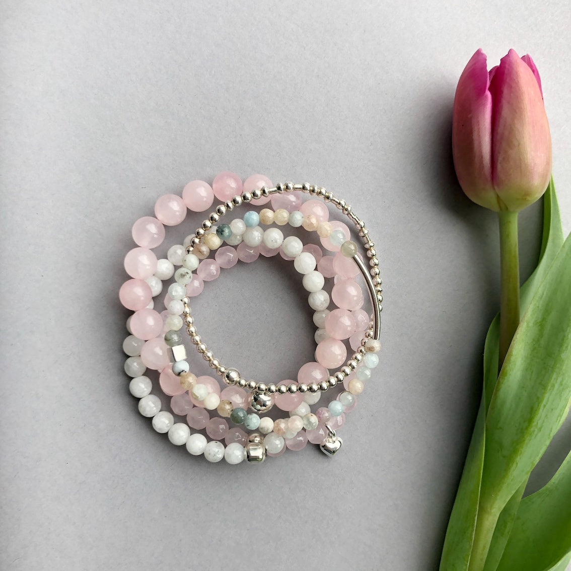 Elements: Sterling Silver, Rose Quartz, Moonstone and Beryl gemstones & elastic cord.