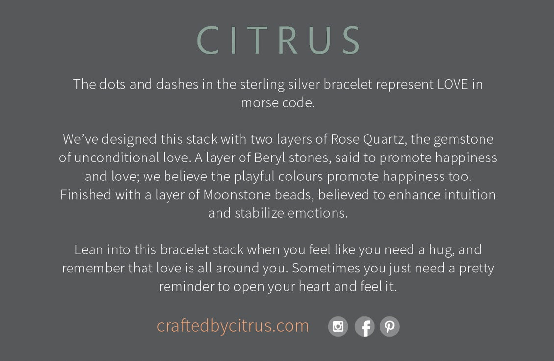 Our Love Morse Code Bracelet Stack is designed to remind you that abundant love is all around you and sometimes you just need a pretty little reminder to open your heart and feel it.