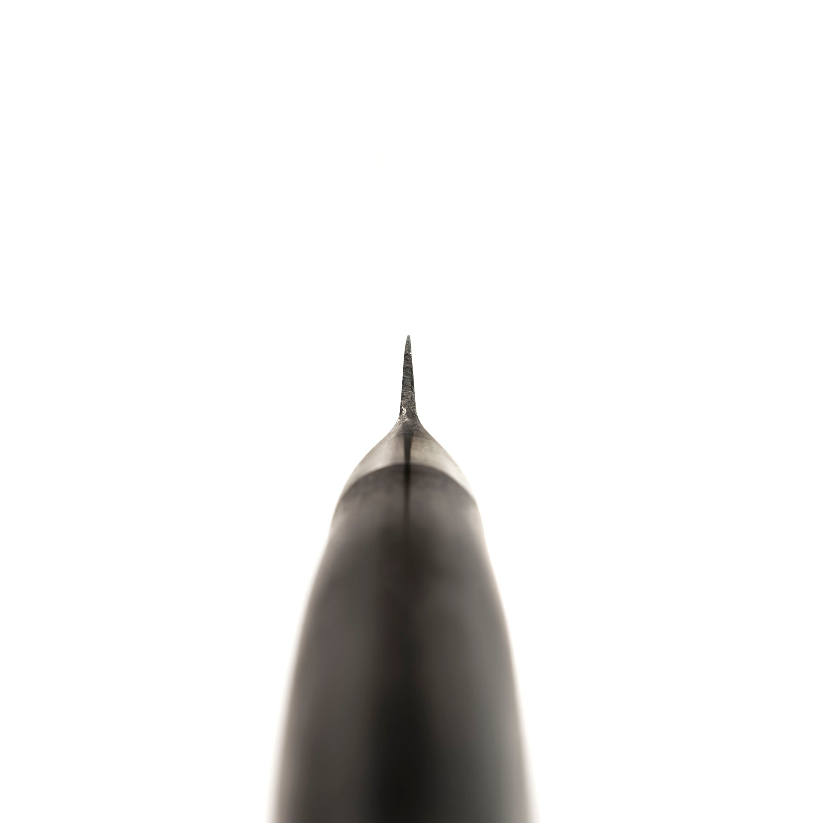 The Honesuki is a Japanese butchery knife originally designed for breaking down chicken. The reverse tanto tip, or K-tip, gives this knife great precision and allows the user to get in between joints and around bones with ease. The thick spine gives the knife a robust feel and though it is thin behind the edge, it's not as thin as other Japanese knives making it slightly less prone to chipping. This knife is not meant to go through bones and will likely chip if used to try to cut bones.