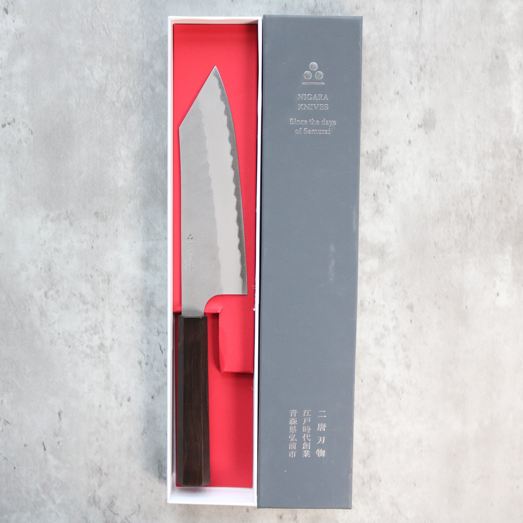 Nigara Hamono is located in Hirosaki city, Aomori Prefecture, on the west coast of the very northern tip of the main island of Honshu, Japan. Their family has a 350 year old history of making knives and swords and more recently has expanded into structural steel beams for use in construction. Tsuyoshi Yoshizawa stands as the 8th generation smith in the lineage of blacksmiths at Nigara Hamono and creates knives with his younger brother and two other craftsmen.