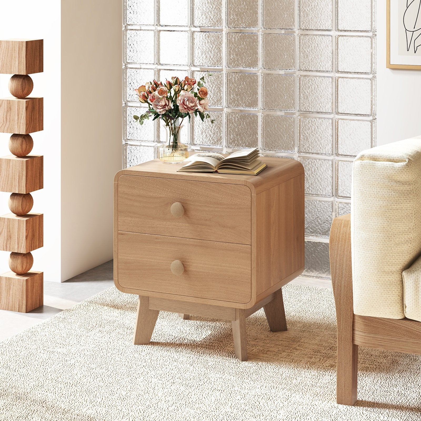 Nightstand with 2 Drawers Solid Rubber Wood Legs-Brown