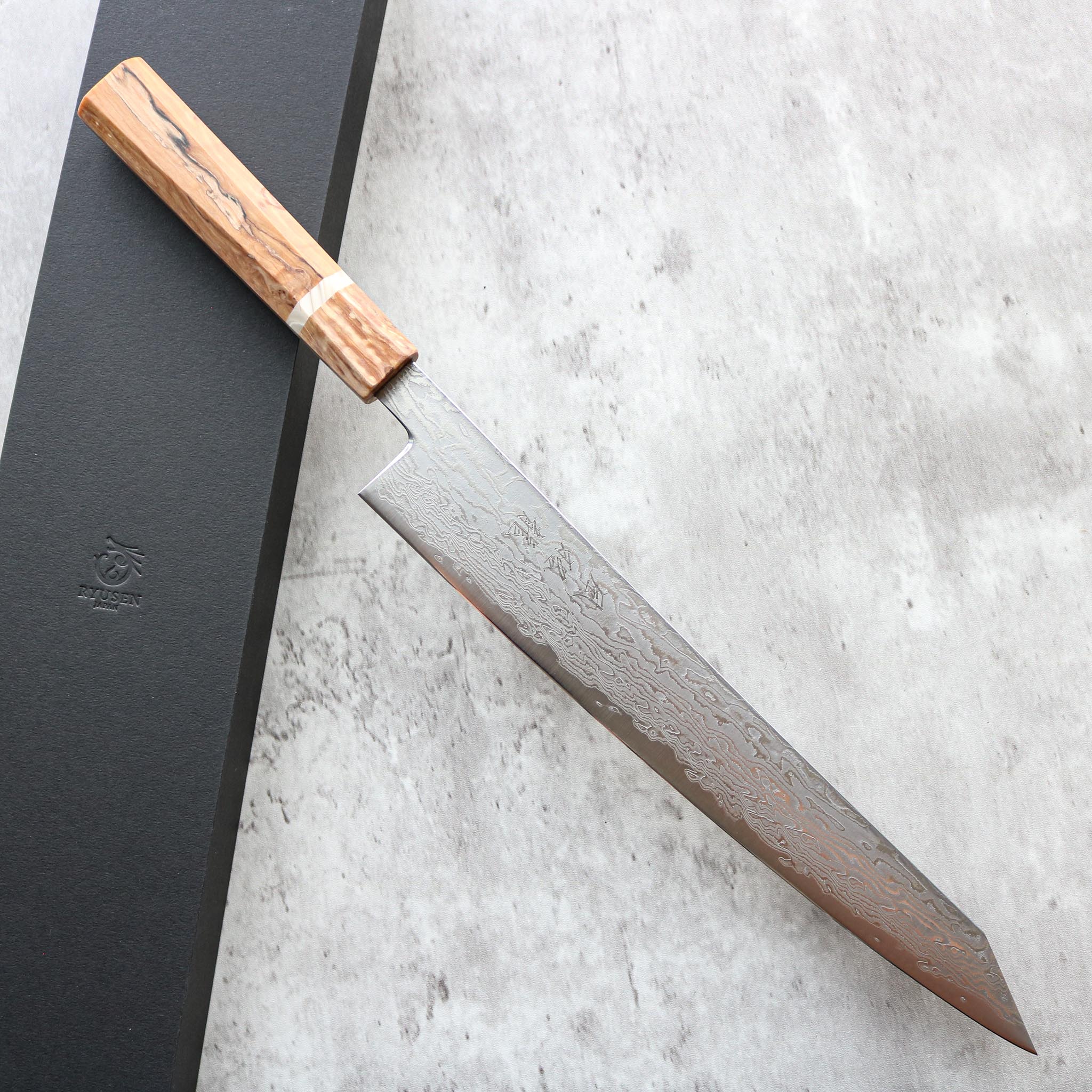 High-quality ATS314 steel, which provides amazing sharpness and is commonly used for knives, barber/hairdressing scissors and other cutting tools, is used for the blade core. The blade is made of this core ATS314 steel and 63-layer stainless steel sandwiching the core, and was forged with the traditional Ryusen forging technique. It is a top-end blade achieving long-lasting sharpness and an elegant design.