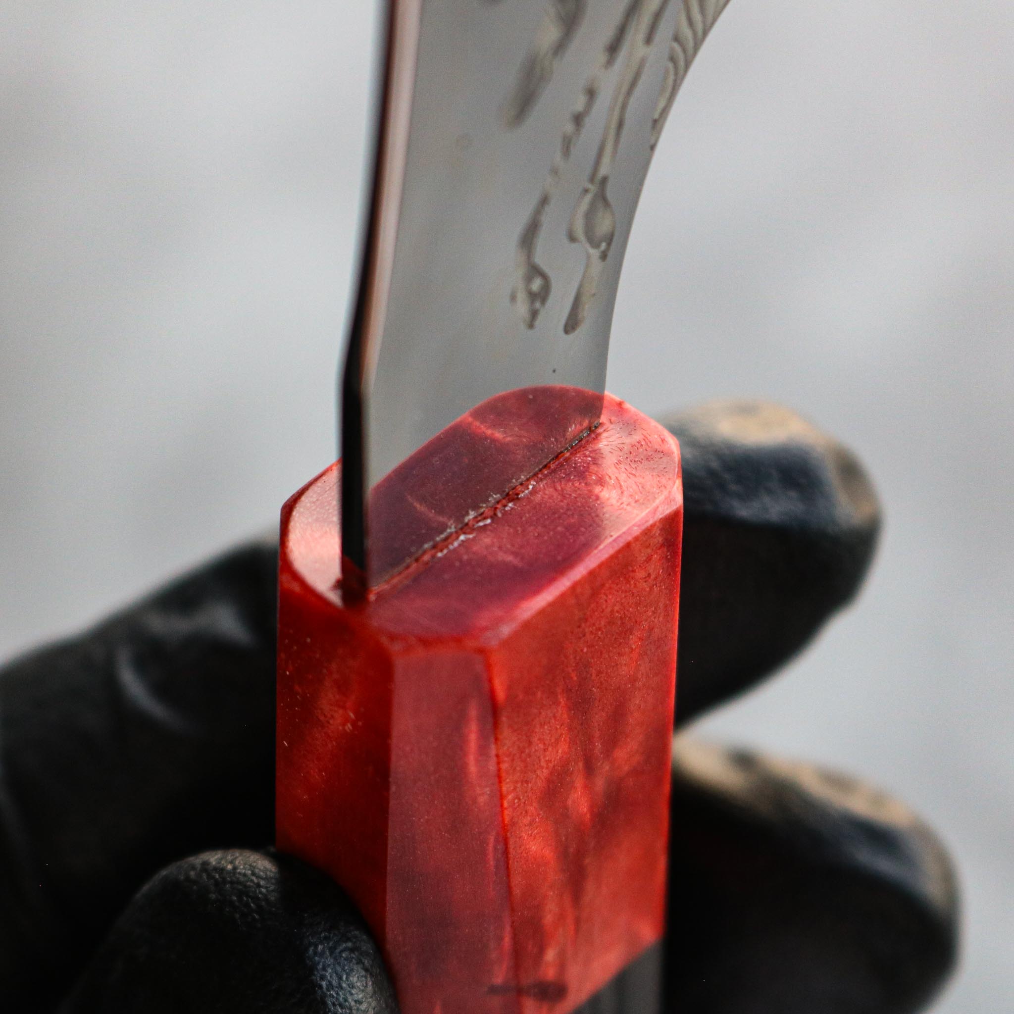 Ryusen Hamono works primarily with SG2/R2, a high powder stainless steel that is very hard and grinds super thin behind the edge. The blades generally have a shorter blade height, which makes them great for precise slicing tasks. Their profiles vary quite a bit, from aggressive sweeping k-tips to more traditional yet modern gyuto shapes. The blades are very consistent, as they employ both modern and traditional techniques, each blade is hand sharpened and impeccably sharp out of the box. Every handle has a unique pattern, particularly the Blazen line, which has a distinctly comfortable taper, compared to the Tanganryu line, which is a hybrid western micarta handle, also with a smooth finish.