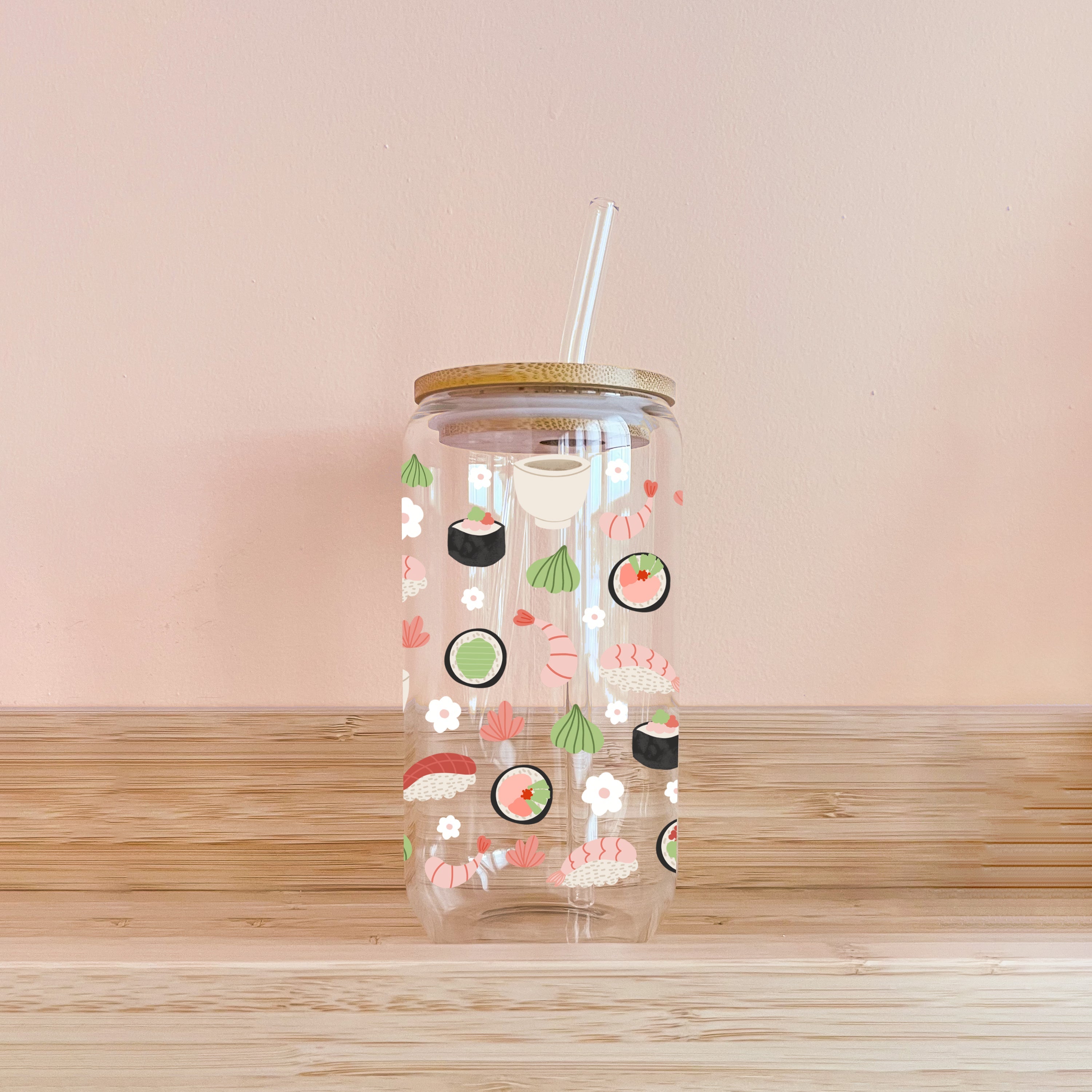 🌸 Verre 16oz avec couvercle en bambou et paille en verre
